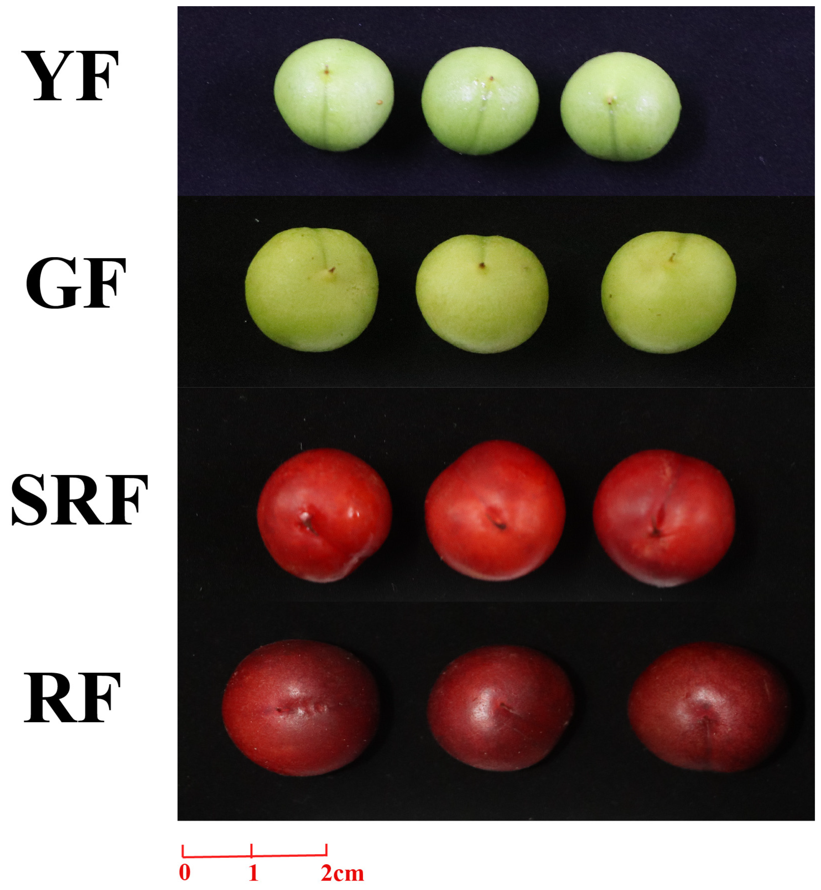 - Ji, X.; Ren, J.; Zhang, Y.; Lang, S.; Wang, D.; Song, X. Integrated analysis of the metabolome and transcriptome on anthocyanin biosynthesis in four developmental stages of Cerasus humilis peel coloration. Int. J. Mol. Sci. 2021, 22, 11880. [Google Scholar] [CrossRef] [PubMed]