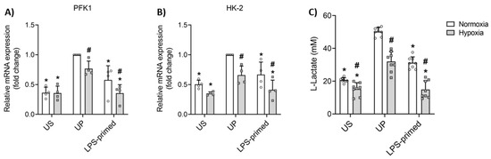 Glycolytic metabolism mediates LPS-priming effects in BV-2 microglia under normoxic and hypoxic conditions in vitro. BV-2 cells after the second challenge on day 4 (100 ng/mL LPS) under normoxic and hypoxic conditions were analyzed for gene expression of (A) phosphofructokinase 1 (PFK1), and (B) hexokinase 2 (HK-2) (N = 4, normalized to GAPDH; unprimed cells under normoxia assigned as 1.0) by real-time PCR. (C) Lactate production (N = 8) in cell culture supernatants was measured using the commercially available L-Lactate Assay Kit. Results are depicted as scatter dot plots, mean + SD, 2-Way ANOVA, * p < 0.05, * versus unprimed (UP) control; # p < 0.05, # versus normoxic condition (white bar).