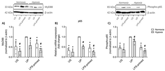 MyD88-dependent regulation of NFκB-p65 contributes to LPS-induced tolerance in vitro. BV-2 cells after the second challenge on day 4 (100 ng/mL LPS) under normoxic and hypoxic conditions were analyzed for (A) MyD88 (N = 5) and (C) phospho-p65 (N = 5) protein expression measured by Western blotting and quantified (unprimed cells under normoxia assigned as 1.0). Gene expression of (B) NFκB-p65 (N = 4, normalized to GAPDH; unprimed cells under normoxia assigned as 1.0) was assessed by real-time PCR. Results are depicted as scatter dot plots, mean + SD, 2-Way ANOVA, * p < 0.05, * versus unprimed (UP) control; # p < 0.05, # versus normoxic condition (white bar).