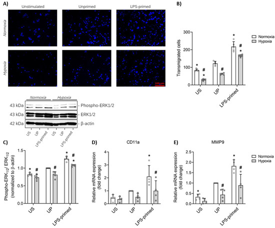 LPS-primed BV-2 microglia exhibit enhanced migratory activity mediated by ERK1/2 signaling pathway. BV-2 cells after the second challenge on day 4 (100 ng/mL LPS) under normoxic and hypoxic conditions were analyzed for their (A) migratory ability using the in vitro transwell migration assay and (B, N = 5) the number of migrated cells (DAPI-stained nuclei) was expressed as the absolute number of transmigrated cells. Protein expression of (C) phospho-ERK1/2 (N = 5) were assayed by Western blotting and quantified (unprimed cells under normoxia assigned as 1.0). RNA samples collected 6 h after the second challenge were analyzed for gene expression of (D) CD11a and (E) MMP9 (N = 4, normalized to GAPDH; unprimed cells under normoxia assigned as 1.0) by real-time PCR. Results are depicted as scatter dot plots, mean + SD, 2-Way ANOVA, * p < 0.05, * versus unprimed (UP) control; # p < 0.05, # versus normoxic condition (white bar).