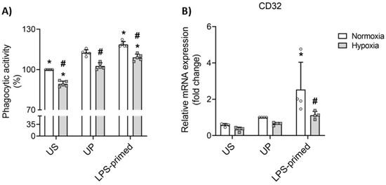 LPS-primed BV-2 microglia triggers increased phagocytic activity in BV-2 microglia in vitro. BV-2 cells after the second challenge on day 4 (100 ng/mL LPS) under normoxic and hypoxic conditions were analyzed for their (A, N = 5) phagocytic activity using a CytoSelect 96-Well Phagocytosis Assay kit and quantified (unstimulated cells under normoxia assigned as 100%). RNA samples collected 6 h after the second challenge were analyzed for gene expression of (B) CD32 (N = 4, normalized to GAPDH; unprimed cells under normoxia assigned as 1.0) by real-time PCR. Results are depicted as scatter dot plots, mean + SD, 2-Way ANOVA, * p < 0.05, * versus unprimed (UP) control; # p < 0.05, # versus normoxic condition (white bar).