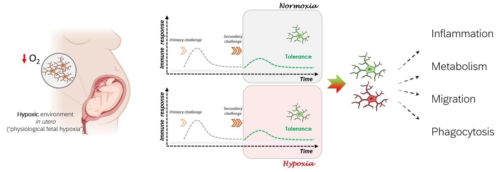 The brain represents one of the most oxygen- and energy-demanding organs, making it particularly susceptible to oxygen deprivation, which can lead to hypoxic injury and, if prolonged, potentially cause irreversible neuronal damage [31,32]. Fetal life evolves in a hypoxic environment, with the oxygen partial pressure (PaO2) being lower than that in postnatal life due to the placental barrier [33,34,35,36]. Known as physiological fetal hypoxia, it usually affects the fetal development from the 23rd–36th week of gestation, subjected initially with slow and progressive reduction of oxygen supply through the placenta [37,38]. However, the impact of physiological fetal hypoxia to the fetomaternal immune-tolerant microglia remains elusive.
