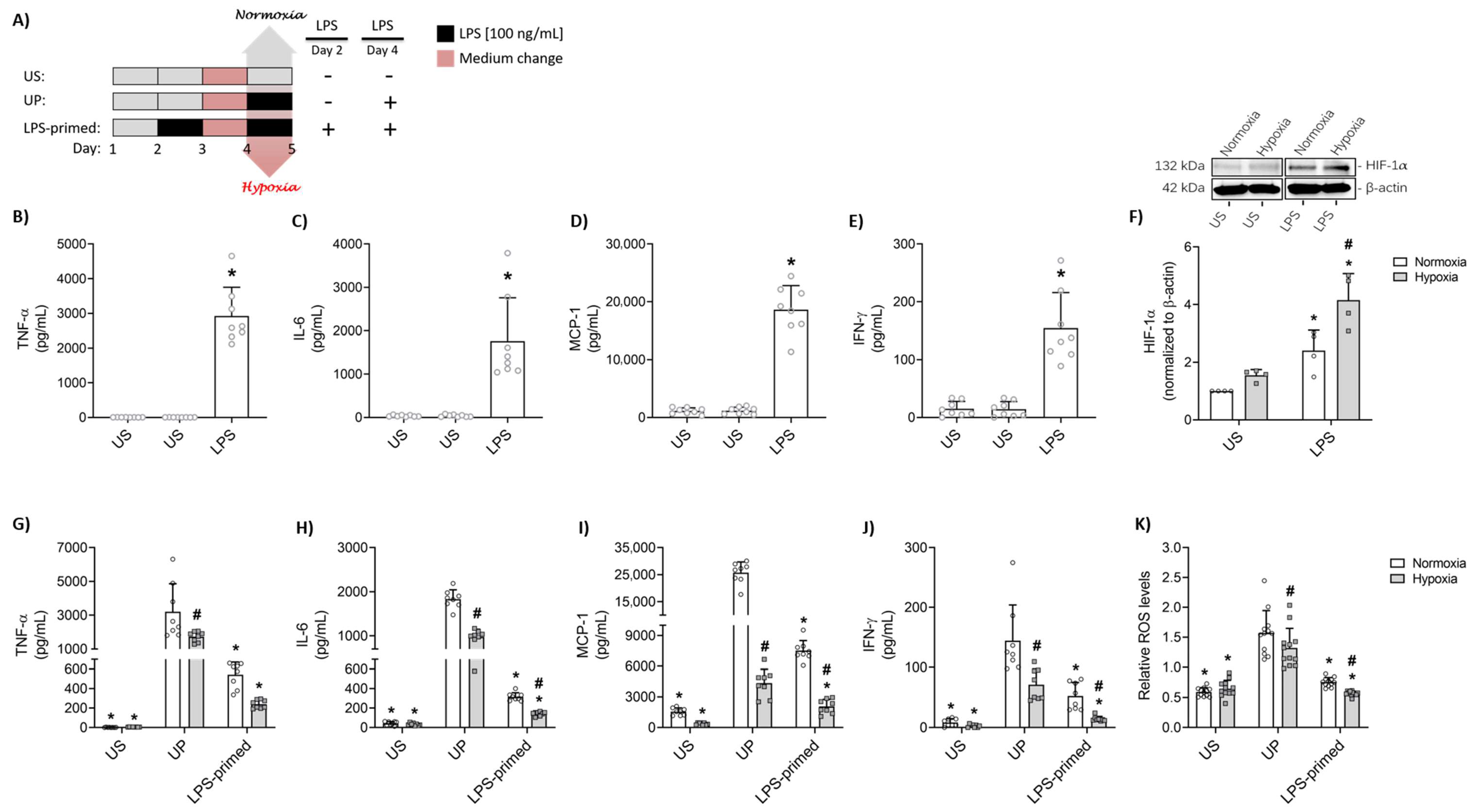 Figure 1. Cytokine, chemokine, and ROS response to LPS stimulation and LPS-priming under normoxic and hypoxic conditions in BV-2 microglia in vitro. (A) Schematic illustration of the two-step protocol used to induce endotoxin tolerance and study its effects under normoxic and hypoxic conditions. BV-2 microglial cells (100,000 cells/well) were stimulated by a fixed dose of LPS (100 ng/mL) on day 1 for 24 h and supernatants were analyzed for their inflammatory cytokine and chemokine production of: (B) TNF-α, (C) IL-6, (D) MCP-1, (E) IFN-γ (N = 8) analyzed by ELISA. Protein lysates 24 h after the stimulation under normoxic or hypoxic conditions were analyzed for their (F) HIF-1α (N = 4) protein expression by Western blotting and quantified (unstimulated cells under normoxia assigned as 1.0). The medium was changed (stimuli washed-out) and after the resting time, cells were challenged by LPS (100 ng/mL) on day 4 under normoxic and hypoxic conditions for 24 h. Supernatants have been collected after the second challenge and analyzed for their levels of: (G) TNF-α, (H) IL-6, (I) MCP-1, (J) IFN-γ (N = 8) assessed by ELISA. (K) ROS levels (N = 4, with n = 3 replicates per experiment) after the second challenge were measured by DCFDA assay. Results are depicted as scatter dot plots with mean + SD. For panels A-E, statistical comparisons were made using a 1-way ANOVA (parametric) or Kruskal–Wallis test (non-parametric), as appropriate. For panels F-K, a 2-Way ANOVA was used. Significance is indicated by * p < 0.05, * versus unstimulated (US, BF) or unprimed (UP, GK) control; # p < 0.05, # versus normoxic condition (white bar).