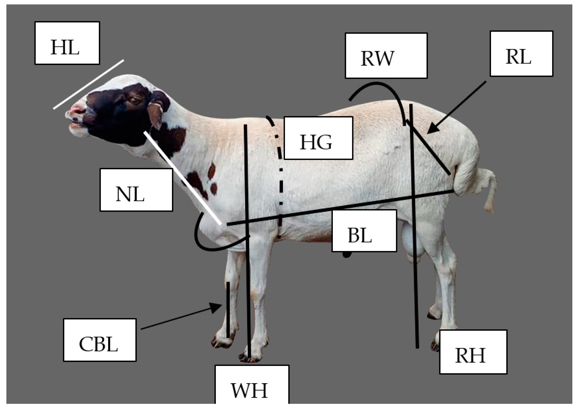 - Sam, I.M.; Usoro, O.O.; Udo, A.F. Relationship of linear body measurements with live body weight in West African Dwarf sheep raised in Tropical Rainforest of Nigeria. JASVM 2023, 8, 46–51. [Google Scholar] [CrossRef]