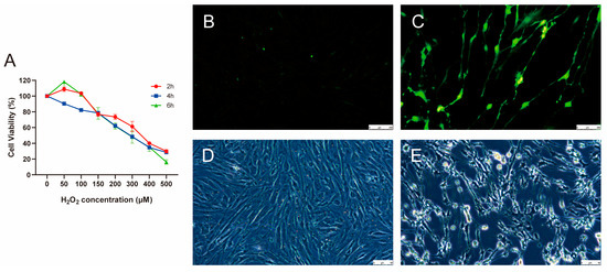 H2O2 (Sigma-Aldrich, St. Louis, MO, USA) was used to induce oxidative stress in the cells. Porcine GCs were treated with various concentrations of H2O2 (0, 50, 100, 150, 200, 300, 400, and 500 μM) for different durations (2, 4, and 6 h). Various studies, such as cell viability assays, ROS detection, and morphological evaluation, were conducted to confirm that H2O2 induces ROS accumulation without deleterious effects on GCs.