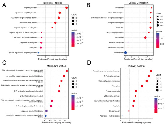 Gene Ontology (GO) analysis indicated that the DE mRNAs were predominantly involved in biological processes associated with apoptosis and cell cycle. DNA-binding transcription factor activity was particularly enriched in the molecular function category (Figure 3A–C). Kyoto Encyclopedia of Genes and Genomes (KEGG) pathway analysis further highlighted the enrichment of DE mRNAs in the tumour necrosis factor (TNF), p53, and apoptosis signaling pathways (Figure 3D). These pathways play a key role in cell survival, proliferation, differentiation, necrosis, and apoptosis. The detailed information for which is provided in Supplementary File S7.