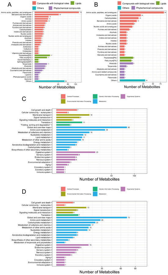 After data quality control, a total of 2316 compounds were identified in the positive ion mode (POS) and 946 in the negative ion mode (NEG). The breakdown of the identified compounds was: 698 in the POS and 364 in the NEG. The identified POS- (Figure 4A) and NEG-specific (Figure 4B) metabolites were classified and annotated using the KEGG database and the Human Metabolome Database (HMDB). It was found that amino acids, peptides, and their analogues, polyketides, and alkaloids were more abundant than other metabolites. Functional annotations of the identified POS (Figure 4C) and NEG (Figure 4D) metabolites were performed using the KEGG database, which revealed that both the POS- and NEG-specific metabolites were enriched in pathways related to amino acid, cofactor, vitamin, and nucleotide metabolism. In addition, the POS-specific metabolites were enriched in lipid and other amino acid metabolism. The NEG-specific metabolites were enriched in carbohydrate and other amino acid metabolism. The detailed information for which is provided in Supplementary Files S9 and S10.