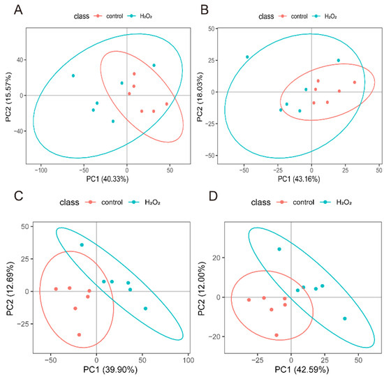 The POS- and NEG-specific metabolites (Figure 5A,B) were analysed separately using PCA, which showed a distinct separation between the H2O2 treatment and control groups. PLS-DA further confirmed that the optimal differentiation between the H2O2 treatment and the control groups was achieved in both the POS (Figure 5C) and NEG (Figure 5D).