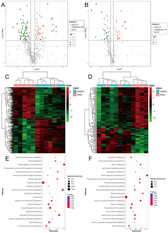 Using the previously defined criteria for differential metabolite screening, 101 differential metabolites were identified in the POS, with 34 upregulated and 67 downregulated metabolites (Figure 6A). In the NEG, 49 metabolites were significantly differentially expressed, including 18 upregulated and 31 downregulated metabolites (Figure 6B). Hierarchical clustering of metabolites specific to the POS (Figure 6C) and NEG (Figure 6D) showed distinct expression patterns between the H2O2 treatment and control groups. Metabolic pathway enrichment analysis revealed that both the POS- (Figure 6E) and NEG-specific (Figure 6F) metabolites were enriched in pathways related to protein digestion and absorption; glycine, serine, and threonine metabolism; amino acid biosynthesis; and carbon metabolism. These findings suggest that H2O2 treatment significantly affects glycine, serine, and threonine metabolism. The detailed information for which is provided in Supplementary Files S11 and S12.