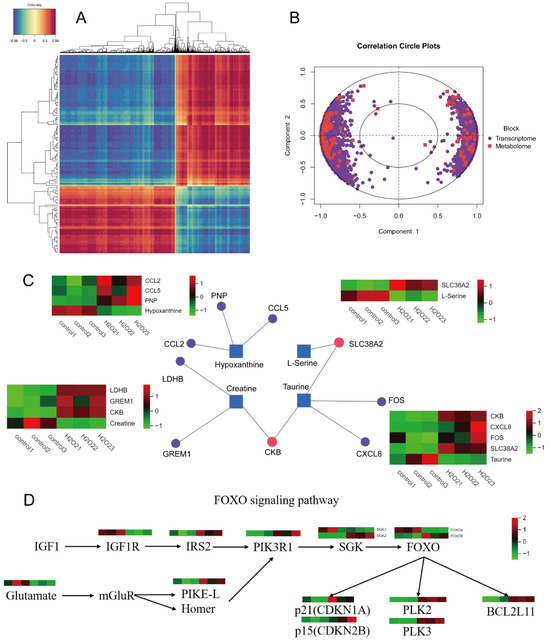 Correlation cluster analysis. (A) Heat map of correlation clustering. (B) Circle graph of correlation concentric. (C) Interactive network analysis diagram. (D) FOXO signalling pathway correlation analysis diagram.