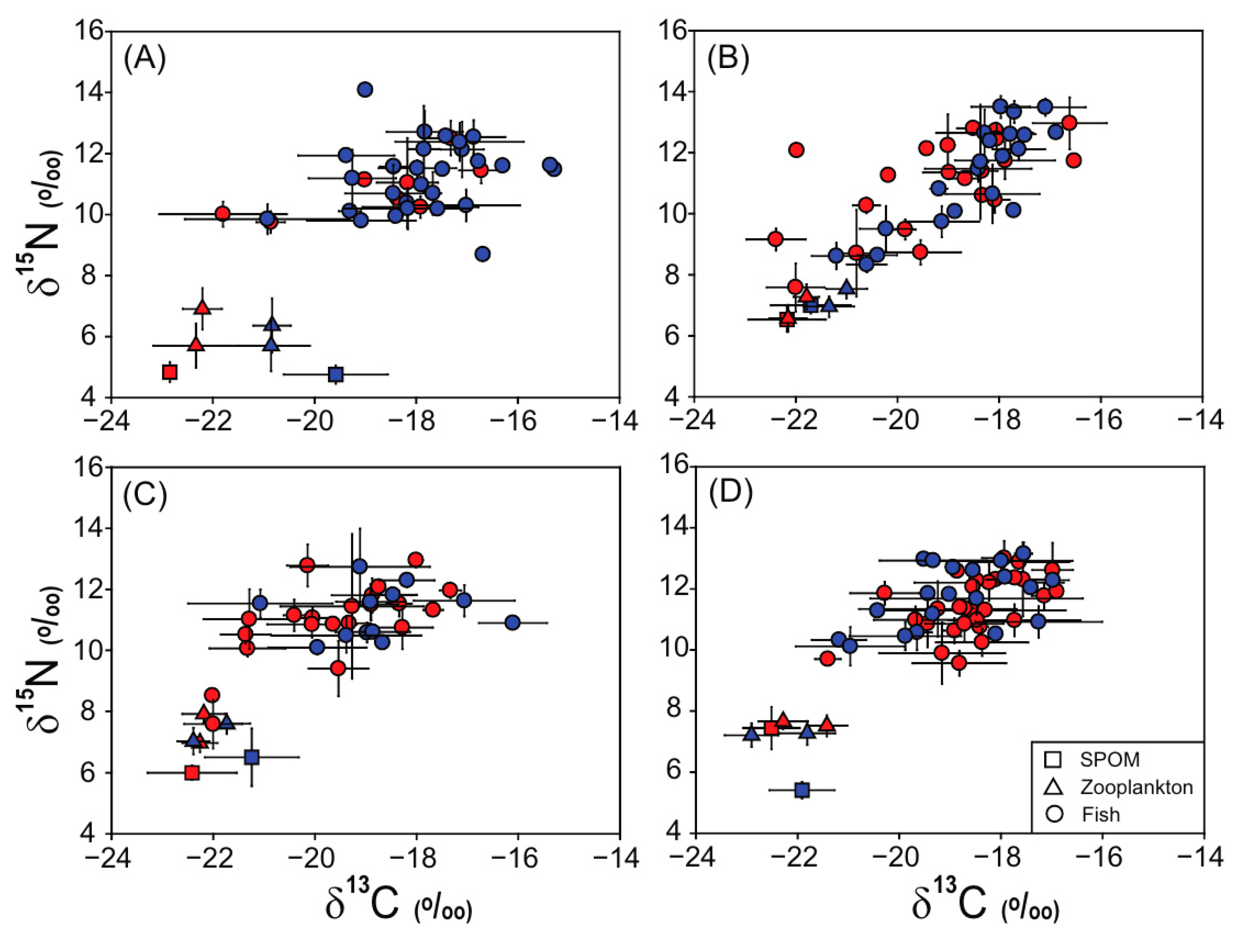 | Euphausiids | 3 | −22.3 | 0.5 | 7.7 | 0.2 | 3 | −21.4 | 0.4 | 7.5 | 0.3 |