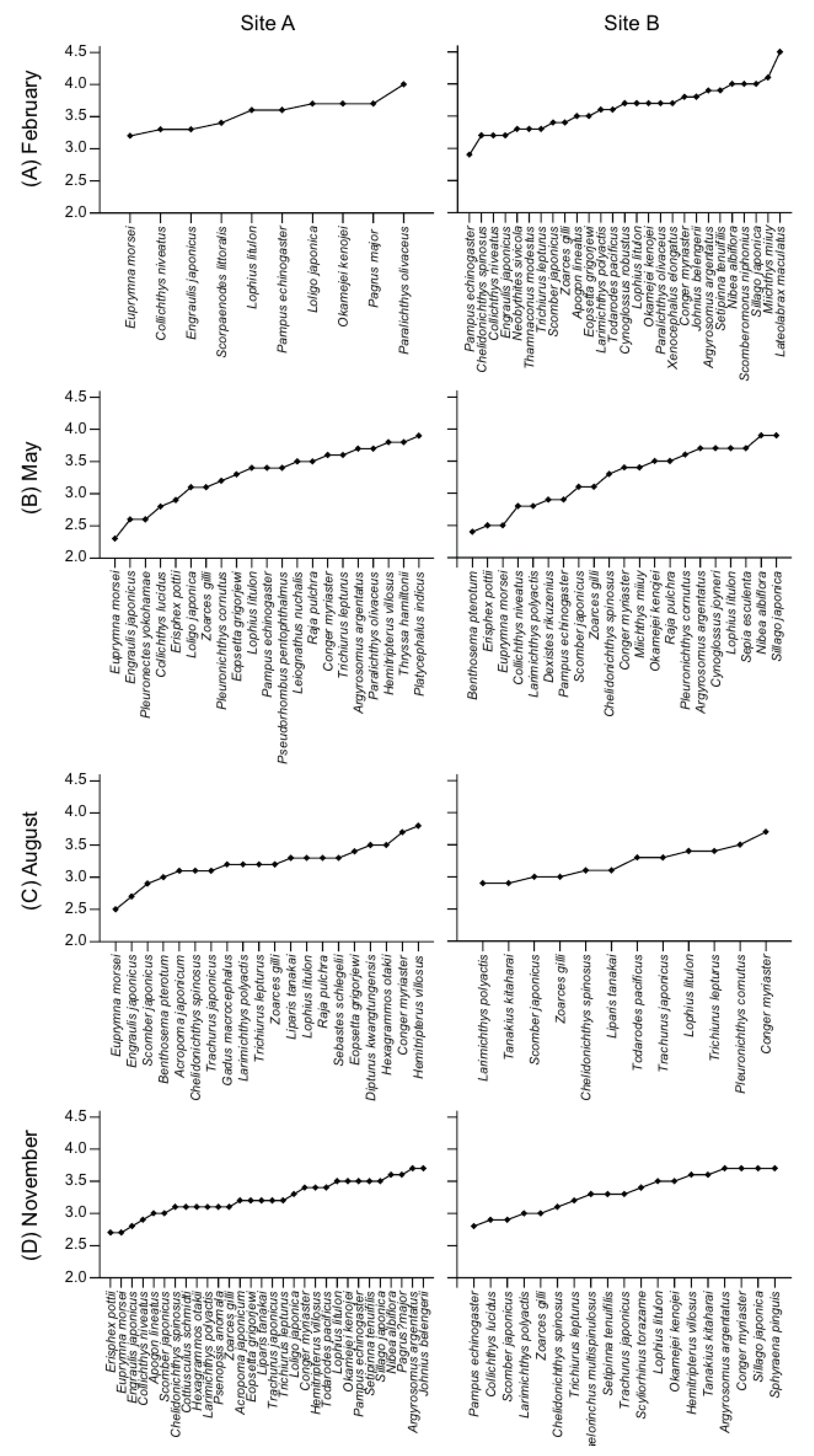 - Park, T.H.; Lee, C.I.; Kang, C.K.; Kwak, J.H.; Lee, S.H.; Park, H.J. Seasonal variation in food web structure and fish community composition in the East/Japan Sea. Estuar. Coast. 2020, 43, 615–629. [Google Scholar] [CrossRef]