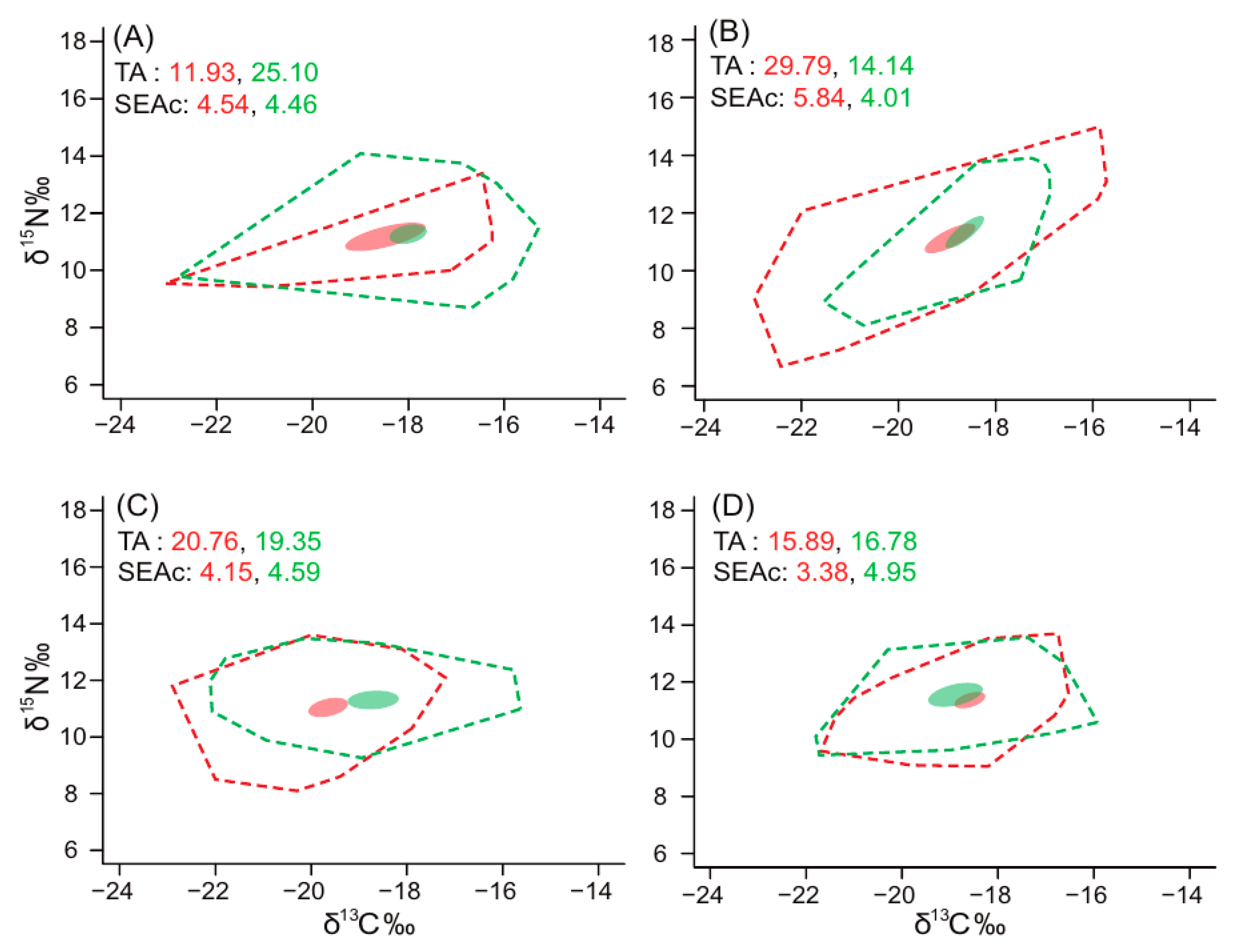 - Jackson, A.L.; Inger, R.; Parnell, A.C.; Bearhop, S. Comparing isotopic niche widths among and within communities: SIBER–Stable Isotope Bayesian Ellipses in R. J. Anim. Ecol. 2011, 803, 595–602. [Google Scholar] [CrossRef]