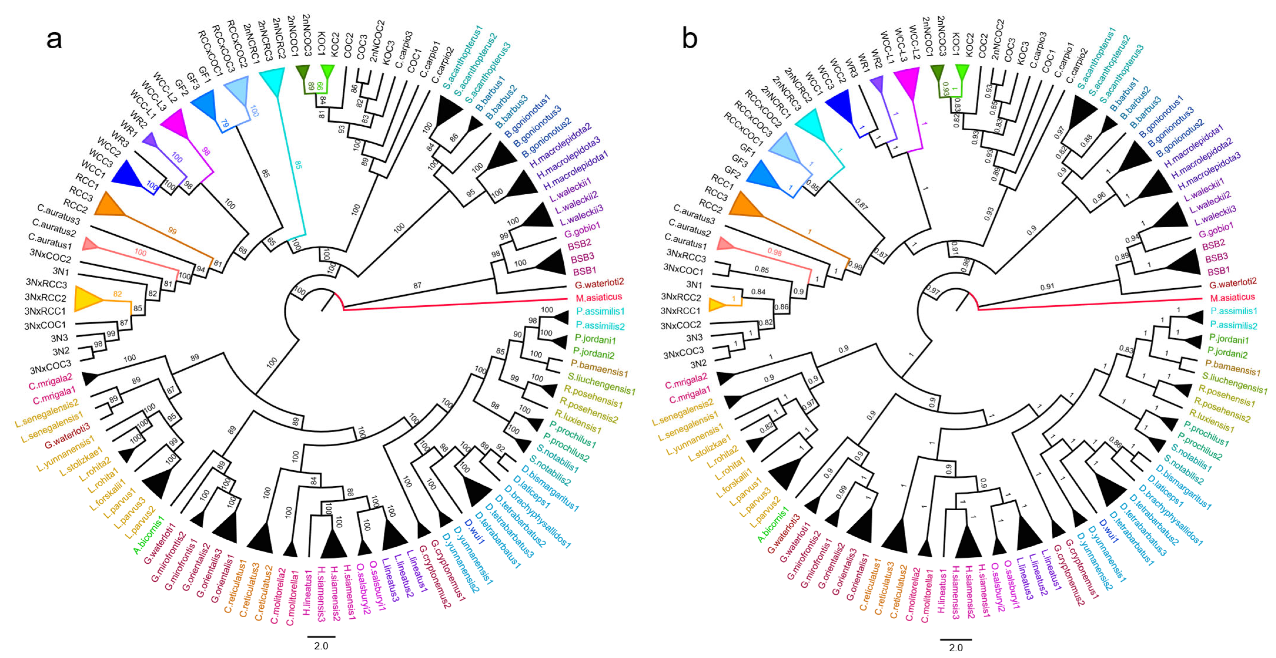 - Ren, L.; Gao, X.; Cui, J.L.; Zhang, C.; Dai, H.; Luo, M.X.; He, S.F.; Qin, Q.B.; Luo, K.K.; Tao, M.; et al. Symmetric subgenomes and balanced homoeolog expression stabilize the establishment of allopolyploidy in cyprinid fish. BMC Biol. 2022, 20, 200. [Google Scholar] [CrossRef]