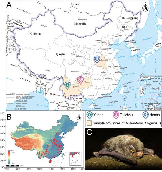 Field sampling was conducted from May to August 2023, corresponding to the peak foraging period of M. fuliginosus and the highest seasonal abundance of nocturnal insects (Figure 1A). Three sites were selected across distinct climatic and ecological zones in China: Henan (Central China), characterized by temperate monsoon climate and mosaic cropland–forest landscapes; Guizhou (Southwest China), dominated by subtropical evergreen broadleaf forests and karst terrain; and Yunnan (Southwest China), featuring a subtropical plateau climate with mixed agricultural and forest habitats. These sites were chosen based on the long-term monitoring records of stable M. fuliginosus roosting colonies, their proximity to agricultural landscapes, and accessibility for field sampling. Sampling was conducted in July 2023, during the summer season, which coincides with the peak abundance of nocturnal insects and the period of the most intense foraging activity of bats. Individuals of M. fuliginosus were captured using mist nets placed at the entrances of known day roosts. Each site was surveyed once during this period to ensure temporal consistency, and fecal samples were collected non-invasively from captured individuals before release. Trapping was performed during the bats’ return flights at dawn, between approximately 00:30 and 02:30 local time. Immediately after capture, individuals were held temporarily in clean and sterile paper bags, and freshly defecated pellets were collected using sterile forceps. Only one fecal sample was collected per individual to avoid pseudoreplication [20]. All fecal samples were individually stored in sterile 2 mL microcentrifuge tubes, kept on ice in the field, and subsequently stored at −80 °C in the laboratory until DNA extraction. At each sampling site, we selected roosts with estimated colony sizes of at least 50 individuals to ensure representative coverage across regions and minimize local environmental bias. Across the three sampling sites, a total of 32 individual fecal samples were successfully collected and analyzed, with sample numbers varying among sites due to differences in colony size and cave accessibility. All field procedures adhered to the ethical guidelines for handling wild bats and were approved by the Institutional Animal Care and Use Committee of Northeast Normal University (Approval No. 202301001).
