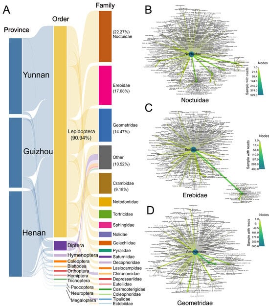 Dietary composition and taxonomic network structure of Miniopterus fuliginosus based on DNA metabarcoding of guano samples from three provinces in China. (A) Sankey diagram showing proportional representation of prey taxa from province to order and family levels. Lepidoptera dominated diet (90.94% of total reads), primarily composed of Noctuidae (22.27%), Erebidae (17.08%), Geometridae (14.47%), Crambidae (9.18%), and other minor families. (B–D) Taxonomic co-occurrence networks of dominant Lepidopteran families—(B) Noctuidae, (C) Erebidae, and (D) Geometridae. Each node represents prey species, with node size indicating number of samples in which taxon was detected. Edge thickness reflects co-occurrence frequency among taxa, and color gradients denote number of samples containing each species.