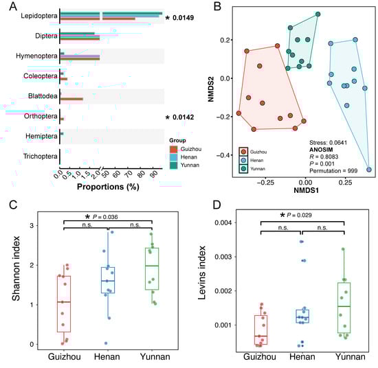 Regional variation in the dietary composition of Miniopterus fuliginosus. (A) The relative read abundance (%) of the six most frequently detected arthropod orders across three provinces (Guizhou, Henan, and Yunnan). Bars represent group means. Asterisks indicate significant overall differences among regions based on Kruskal–Wallis tests (p < 0.05). (B) A non-metric multidimensional scaling (NMDS) plot based on the Bray–Curtis dissimilarity of prey composition. (C) Box plots of prey diversity (Shannon index). (D) Box plots of dietary niche breadth (Levins index). Each point represents an individual fecal sample. ‘n.s.’ indicates non-significant differences (p > 0.05).