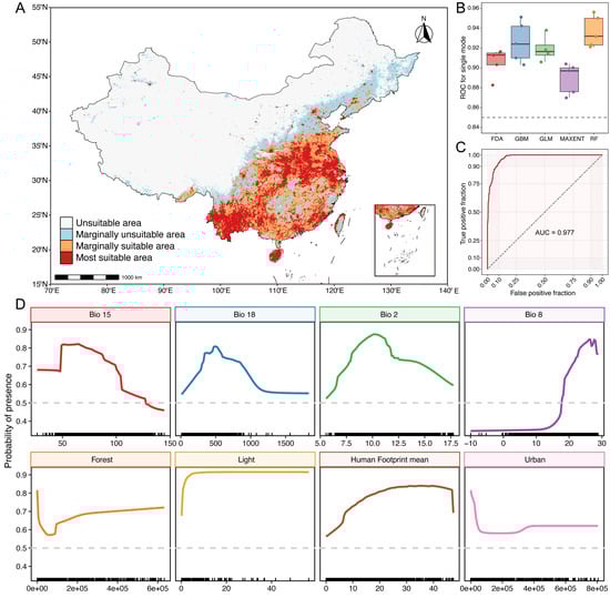 Current and projected distributions and model performance for Miniopterus fuliginosus. (A) Current predicted distribution of suitable habitat based on ensemble species distribution models. (B) ROC scores for five algorithms used in model construction. (C) AUC values for ensemble species distribution model. (D) Response curves of top eight environmental predictors derived from ensemble species distribution model. Each panel illustrates marginal effect of single predictor variable on probability of presence while holding other variables constant.