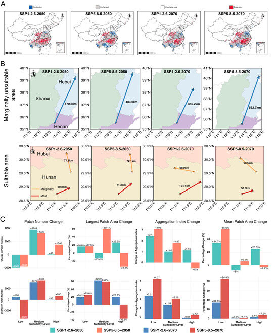 Projected changes in spatial distribution and landscape configuration of climatically suitable habitats for Miniopterus fuliginosus under two emission scenarios (SSP1–2.6 and SSP5–8.5) for 2050s and 2070s. (A) Contraction (blue), expansion (red), unchanged (gray), and unsuitable (white) areas of habitat suitability are mapped. (B) Latitudinal centroid shifts are shown, indicating progressive northward displacement of suitable habitat, with stronger displacement under SSP5–8.5 than under SSP1–2.6. Top row shows shifts in marginally unsuitable areas (defined as regions with habitat suitability index of 0.1–0.29), and bottom row shows shifts in suitable areas (marginally suitable areas with index of 0.29–0.5 and most suitable areas with index of 0.5–1). Arrows indicate direction and magnitude of centroid movement: blue arrows represent shifts in marginally unsuitable areas, orange arrows represent shifts in marginally suitable areas, and red arrows represent shifts in most suitable areas. Different provinces are represented with different colors. (C) Quantification of landscape-level changes in patch number under different scenarios, largest patch area, aggregation index, and mean patch area across low, medium, and high suitability classes. Colors distinguish scenarios: green (SSP1–2.6 2050s), orange (SSP5–8.5 2050s), blue (SSP1–2.6 2070s), and red (SSP 5–8.5 2070s).