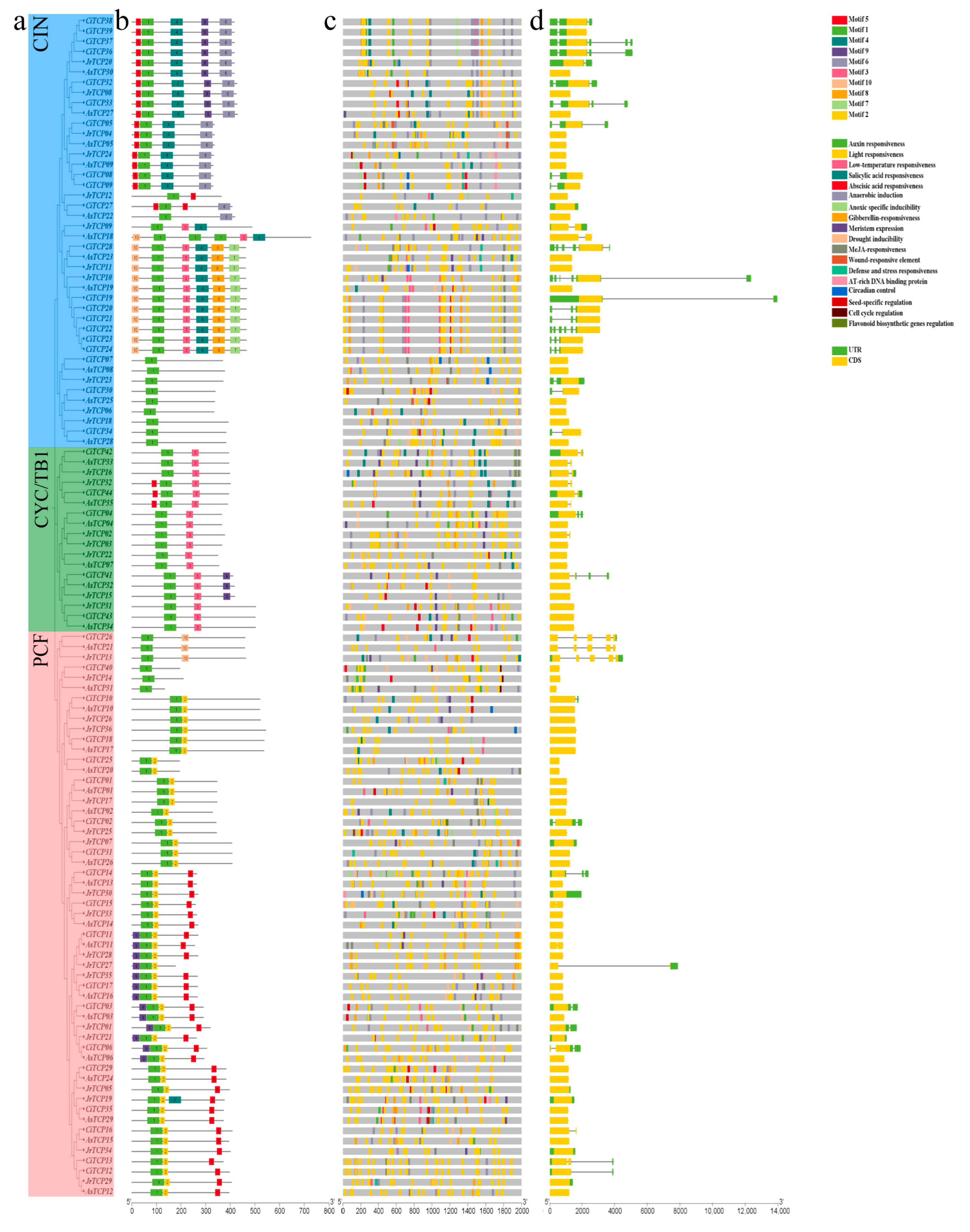 3.3. Conserved Motifs, Gene Structure, and Promoter Analysis of TCP Gene Family