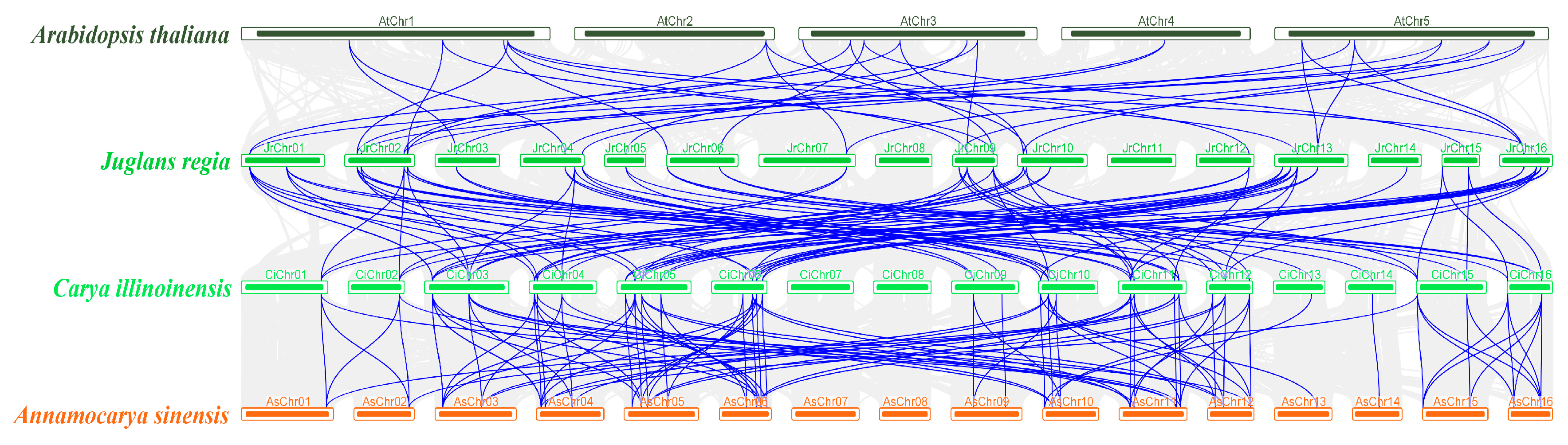 - Zhou, H.; Hu, Y.; Ebrahimi, A.; Liu, P.; Woeste, K.; Zhao, P.; Zhang, S. Whole genome based insights into the phylogeny and evolution of the Juglandaceae. BMC Ecol. Evol. 2021, 21, 191. [Google Scholar] [CrossRef]