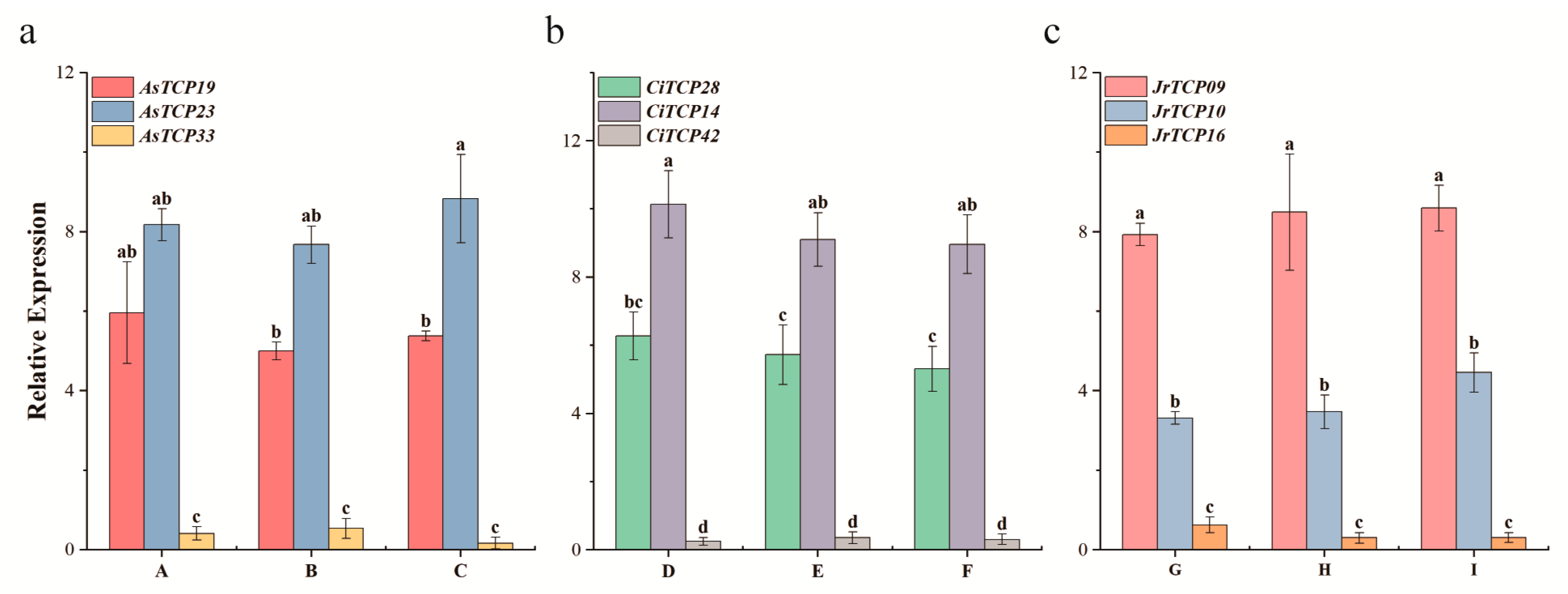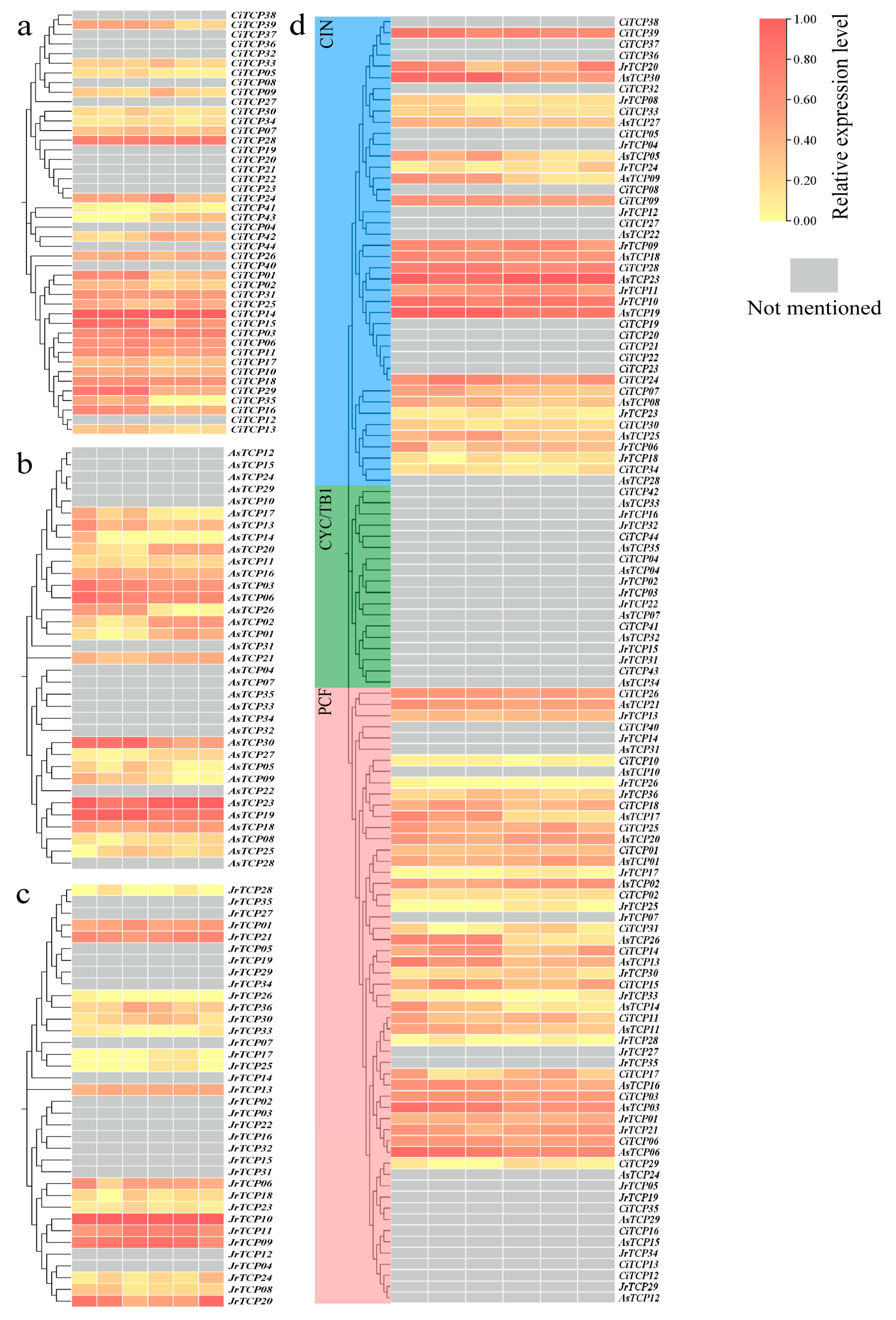 - Wang, Y.; He, W.; Wang, L.; Lan, Y.; Wu, M. TCP transcription factor identification in pecan (Carya illinoensis) and salt tolerance function analysis of CiTCP8. Sci. Hortic. 2024, 330, 113051. [Google Scholar] [CrossRef]