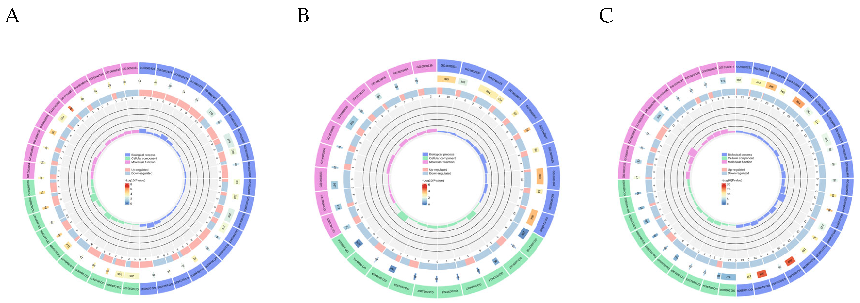 3.3.3. DEmRNA-DEmiRNA Correlation Analysis and Functional Analysis of Target Genes