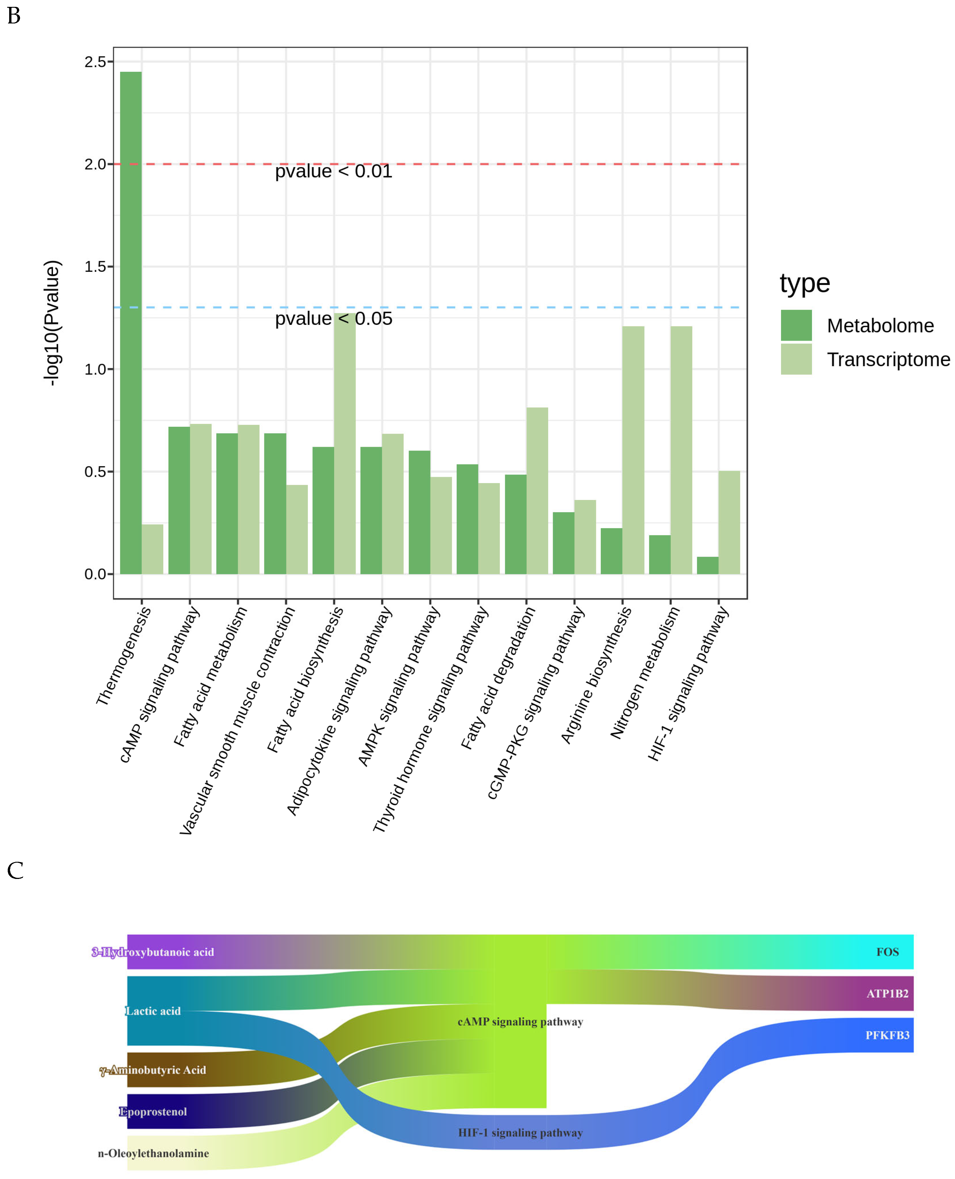 3.5. Integrated Transcriptomic and Metabolomic Analysis