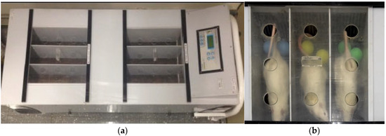 For the exercise sessions, a motorized treadmill insight (Insight, model EP-131, Ribeirão Preto, SP, Brazil) was used, consisting of 6 individual stalls with a height of 15 cm, an internal width of 10 cm and a length of 50 cm (Figure 2a). The equipment had electronic speed, time, and electrostimulation regulators, all controlled by a digital panel that displayed speed (m/min), time (minutes), distance (meters), and amperage (mA). The tilt was manually adjusted and remained steady throughout the experiment. Before the protocols began, the equipment underwent inspection and calibration. No electrical stimulation was used in the exercise sessions; only table tennis balls were used to stimulate the animals by touch and sound to follow the course of the treadmill (Figure 2b).