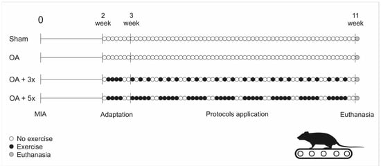 The aerobic exercise sessions were conducted from the 15th day after intra-articular injection of MIA (Figure 3), in which all animals in the exercise groups were exposed to 4 days of treadmill adaptation at a speed of 10 m/min, with no incline and with time progression (1st day: 10 min, 2nd day: 15 min, 3rd day: 20 min, and 4th day: 25 min). After the adaptation period, the animals were subjected to training for 8 weeks, with a weekly frequency of 3 or 5 times (Figure 3), performed on a treadmill without incline, 30 min/day, at a speed of 13 m/min for the first 4 weeks of training and a speed of 16 m/min in the subsequent weeks, as adapted from [29]. It should be noted that to eliminate any eventualities that could lead to the interruption of the exercise, regardless of the cause, the animals were monitored by the researchers during all sessions.
