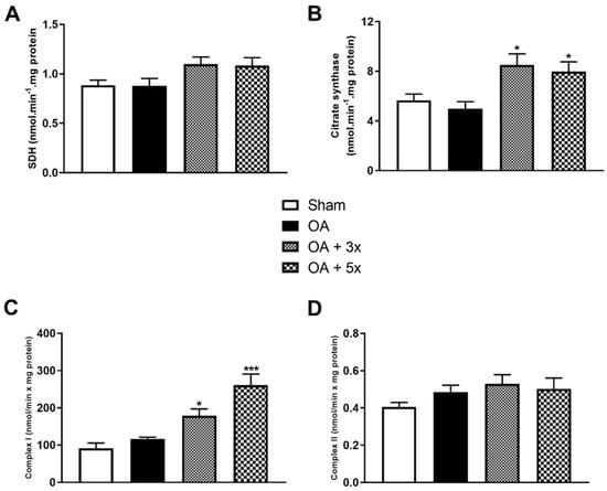 Effects of moderate exercise treatment performed 3 or 5 times per week on metabolic activity. The graphs show evaluations of SDH in (A), CS in (B), Complex I in (C), and Complex II in (D). These evaluations were performed on samples from the gastrocnemius muscle. Abbreviations: SDH, succinate dehydrogenase; CS, citrate synthase. Data are presented as mean ± SDM where * p < 0.05 vs. OA group; *** p < 0.001 vs. OA group; (One-way ANOVA followed by Tukey’s post hoc test).