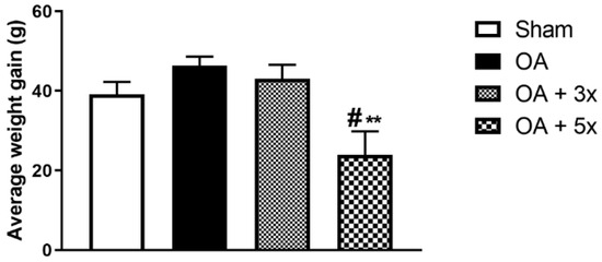 Effects of moderate exercise treatment performed 3 or 5 times per week on average body weight gain. This evaluation was performed based on the total body mass gain of the animals. Abbreviations: g, grams. Data are presented as mean ± SDM where # p < 0.05 vs. sham group; ** p < 0.01 vs. OA group; (One-way ANOVA followed by Tukey’s post hoc test).