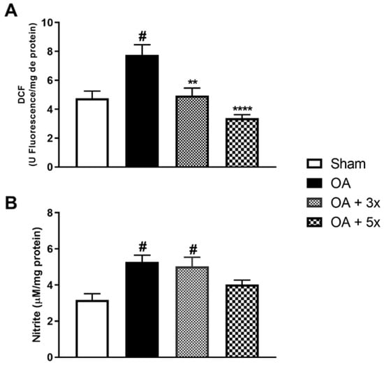 To analyze aspects of oxidative stress, the activity of oxidant molecules was evaluated according to Figure 6. In A, the OA group showed a significant increase in DCF compared to the Sham group (p = 0.0056). Furthermore, in contrast to the OA group, there was a significant decrease in DCF in both the OA + 3× group (p = 0.0072) and especially in the OA + 5× group, with an even greater significant decrease (p = 0.0004) with a high effect size (R2 = 0.60). In B, the OA + 5× group showed no significant difference in nitrite levels compared to the sham group data. However, both the OA group (p = 0.0077) and the OA + 3× group (p = 0.0163) showed a significant increase in nitrite compared to the sham group and a high effect size (R2 = 0.44).