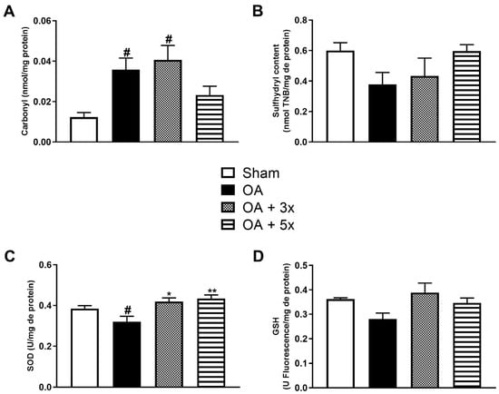 Effects of moderate exercise treatment performed 3 or 5 times a week on oxidative damage and antioxidant levels. The graphs show the evaluations of Carbonyl in (A), Sulfhydryl content in (B), SOD in (C), and GSH in (D). These evaluations were performed from samples of the intracapsular tissues of the knee joint. Abbreviations: SOD, superoxide dismutase; GSH, glutathione. Data are presented as mean ± SDM where # p < 0.05 vs. sham group; * p < 0.05 vs. OA group; ** p < 0.01 vs. OA group; (One-way ANOVA followed by Tukey’s post hoc test).