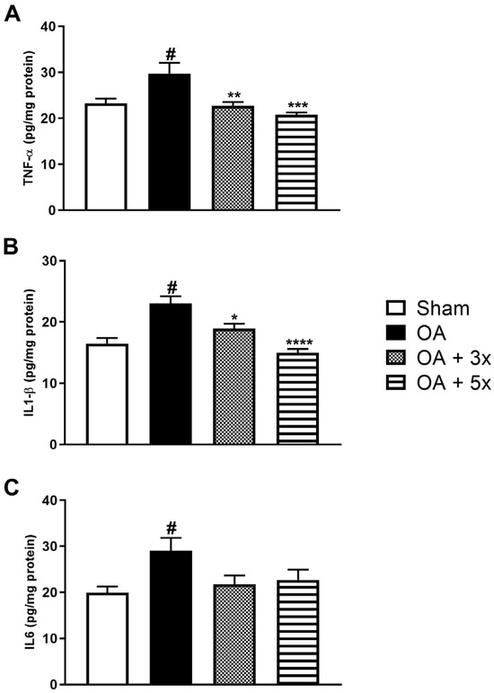 An assessment of pro-inflammatory conditions was also performed using cytokines such as TNF-α, IL1-β, and IL6 (Figure 8). In A, the OA group showed a significant increase in TNF-α levels compared to the sham group (p < 0.0086). In contrast to the OA group, there was a significant decrease in TNF-α expression both in the OA + 3× group (p = 0.0032) and especially in the OA + 5× group with an even greater significant decrease in these markers (p = 0.0001), in addition to demonstrating a high effect size (R2 = 0.56). In B, the OA group showed a significant increase in IL1-β compared to the Sham group (p = 0.0002). In contrast, the OA + 3× (p = 0.0138) and OA + 5× (p < 0.0001) groups showed a significant decrease with a high effect size (R2 = 0.65) of this same cytokine compared to the OA group. In C, the OA group showed a significant increase in IL6 compared to the sham group (p = 0.0297). On the other hand, the exercise-treated groups showed no significant differences compared to the sham group, also showing a high effect size (R2 = 0.29).
