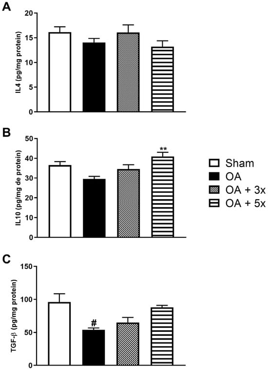 Effects of moderate exercise treatment performed 3 or 5 times a week on anti-inflammatory cytokine levels. The graphs show the evaluations of IL4 in (A), IL10 in (B), and TGF-β in (C). These evaluations were performed using samples from the intracapsular tissues of the knee joint. Abbreviations: IL, interleukin; TGF, transforming growth factor. Data are presented as mean ± SDM where # p < 0.05 vs. sham group; ** p < 0.01 vs. OA group; (One-way ANOVA followed by Tukey’s post hoc test).