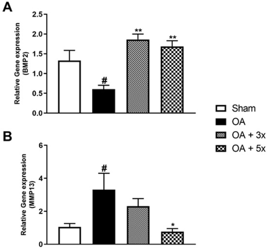 Figure 10 demonstrates the results of the quantification of BMP2 and MMP13 gene expression by PCR. In A, the OA group showed a significant decrease in BMP2 expression compared to the Sham group (p = 0.0391). On the other hand, the OA + 3× (p = 0.001) and OA + 5× (p = 0.0037) groups showed a significant increase with a high effect size (R2 = 0.68) compared to the AO group. In B, the AO group had a significant increase in MMP13 gene expression compared to the Sham group (p = 0.0343). However, the OA + 5× group showed a significant decrease compared to the AO group (p = 0.018) with a high effect size (R2 = 0.63).