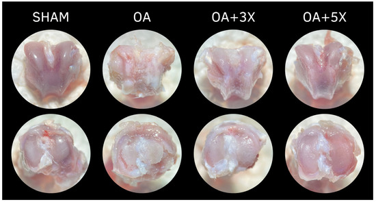 To present representative images of the morphology of the articular tissues of each group (n = 3 animals/group), macroscopic images were captured using the stereomicroscope (Zeiss STEMI DV4, Göttingen, Germany) with a magnification of up to 32×. The image that best represents the profile of each group was selected by 2 separate researchers. In case of a disagreement, a third researcher was called in. The images of the profile of each group show the structures of both the femoral condyle and the tibial plateau. The images are purely representative.