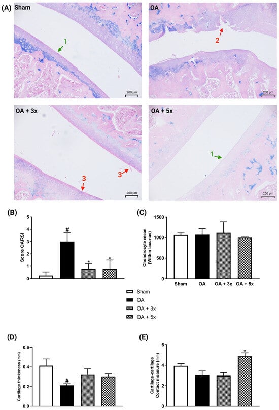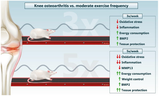 Osteoarthritis (OA) is a chronic, multifactorial joint disease characterized by cartilage degeneration, inflammation, oxidative stress, and bone changes [1,2,3,4]. Physical exercise is one of the main therapies recommended for the treatment of OA [5,6,7,8,9]. It can act on several factors such as weight control, muscle strengthening, and modulation of inflammation and redox state [6,10,11].