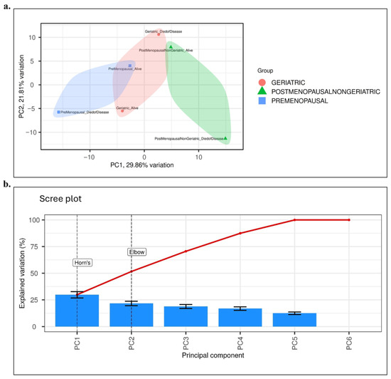 Results of Principal Component Analysis (PCA). (a) PCA score plot illustrating the distribution of patient samples according to clinical groups: Premenopausal (blue), Postmenopausal–non-geriatric (green), and Geriatric (red). Survival status is indicated by different symbols (circle: alive, triangle: died of disease). Ellipses represent the 95% confidence interval for each group. The first two principal components explain 29.9% (PC1) and 21.8% (PC2) of the total variance, respectively. (b) Scree plot analysis showing the contribution of principal components to the explained variance. Both Horn parallel analysis test and the elbow criterion confirmed that PC1 and PC2 represent the major sources of variance and should be considered in subsequent interpretations. Blue bars represent the explained variation (%) for individual PCs, while the red line indicates the cumulative variance across components.