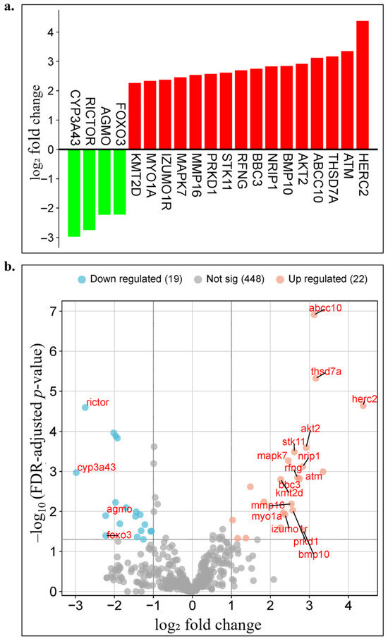 The genes showing significant differential expression are presented in Figure 2a,b. In Figure 2a, a bar plot displays genes ranked according to their log₂ fold change values, with upregulated genes highlighted in red (e.g., HERC2, ATM, THSD7A, AKT2, BBC3) and downregulated genes in green (e.g., CYP3A43, AGMO, RICTOR, FOXO3). Figure 2b illustrates a volcano plot in which all genes are positioned based on their log₂ fold change and −log10(adjusted p-value) values; upregulated genes are shown in red, downregulated in blue, and statistically nonsignificant genes in gray. According to the predefined statistical thresholds (|log2 fold change| ≥ 2 and FDR ≤ 0.1), a total of 41 genes exhibited significant differential expression, including 22 upregulated and 19 downregulated genes. The remaining 448 genes were not statistically significant. Several genes demonstrated marked expression changes with log₂ fold change values exceeding ±2. In particular, HERC2, ATM, THSD7A, and ABCC10 showed strong upregulation with |log2 fold change| > 3, whereas CYP3A43, RICTOR, AGMO, and FOXO3 displayed pronounced downregulation with |log2 fold change| < −2 (Figure 2, Table 2).