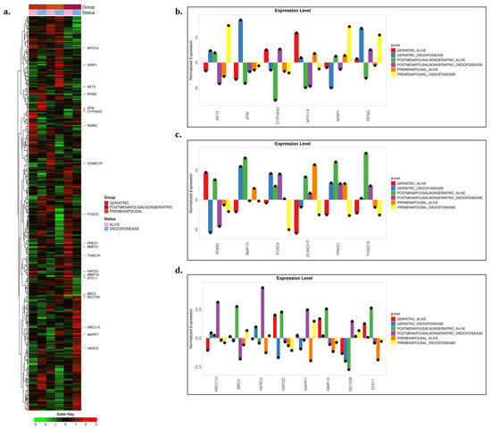 METABRIC transcriptome analyses (Figure 3a–d) were performed by jointly evaluating age groups (premenopausal, postmenopausal–non-geriatric, geriatric) and clinical outcomes (alive/died of disease). The findings revealed distinct expression patterns in many genes depending on age and clinical status, with the most pronounced separation observed in the postmenopausal–non-geriatric group. Overall assessment across the six subgroups indicated that certain genes consistently emerged as discriminative biomarkers along both the age and clinical outcome axes. Specifically, AKT2 showed strong upregulation in the premenopausal–died of disease group, reflecting a profile unique to young-age mortality. ATM was downregulated in the geriatric–alive group but upregulated in the geriatric–died of disease group, linking it to late-age mortality. CYP3A43 played a critical role in distinguishing survival versus mortality, particularly in the postmenopausal cohort. MYO1A was upregulated in association with survival at older ages, while also exhibiting a sharp alive–died of disease contrast in the premenopausal group. NRIP1 and RFNG displayed opposite directional patterns across age groups, offering age-specific discriminative profiles. Moreover, AGMO and KMT2D emerged as coordinated epigenetic and metabolic regulators reflecting survival–mortality divergence in older patients. BMP10 demonstrated strong upregulation associated with postmenopausal survival and geriatric mortality. FOXO3 presented an age-stage-sensitive pattern, showing downregulation in association with young-age mortality but upregulation with late-age mortality. IZUMO1R exhibited a dynamic, outcome-sensitive profile, being downregulated in association with survival in older patients, upregulated in younger and middle-aged groups, and downregulated again in premenopausal mortality. PRKD1 showed upregulation linked to survival in younger patients, downregulation with mortality, and upregulation observed again in geriatric mortality.