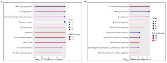 Visualization of the top enriched KEGG pathways for upregulated (a) and downregulated (b) genes. The x-axis represents the −log10 of the FDR-adjusted p-value, the dot size indicates the number of genes involved in each pathway, and the color gradient denotes fold enrichment.