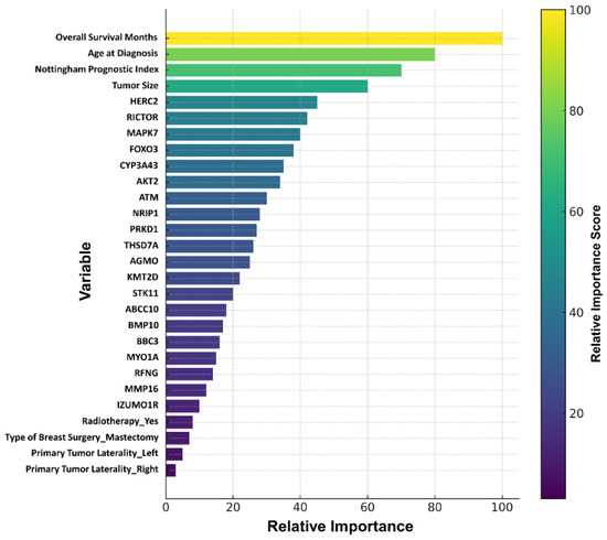 The dataset consisted of a total of 458 patient records (313 alive, 145 died of disease) and was randomly split into 70% training (n = 320) and 30% testing (n = 138) subsets. To address class imbalance in the training set, SMOTE was applied, while the original distribution of the test set was preserved without any modifications. This ensured that the predictive performance of all models was evaluated on the same test set, reflecting the true data distribution. During the data partitioning stage, 30% of the data were reserved exclusively for testing, while the remaining 70% underwent stratified 5-fold cross-validation. This approach enabled the test set to serve as an independent validation cohort, allowing the assessment of model performance on previously unseen data. Statistically significant clinical and demographic variables, together with target genes identified from the DEG analysis (a total of 27 variables, Figure 5), were evaluated using the Boruta algorithm. The analysis identified variables with relative importance values ≥ 20%. The highest contributions were observed for Months (100.0), Age at diagnosis (68.2), Nottingham Prognostic Index (58.1), and Tumor size (53.1). At the gene level, the most prominent biomarkers included HERC2 (40.9), RICTOR (31.5), MAPK7 (30.5), FOXO3 (27.6), CYP3A43 (26.8), AKT2 (26.6), ATM (26.2), NRIP1 (26.1), PRKD1 (24.6), THSD7A (23.5), AGMO (23.1), KMT2D (22.7), and STK11 (20.1) (Figure 5).