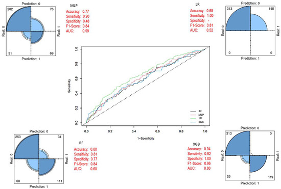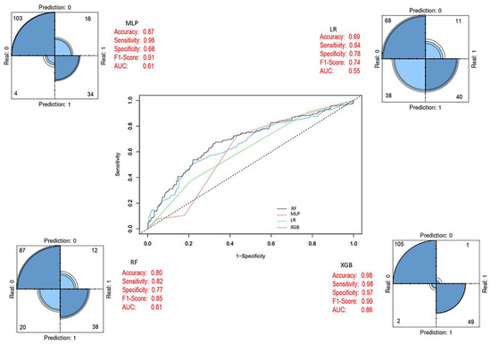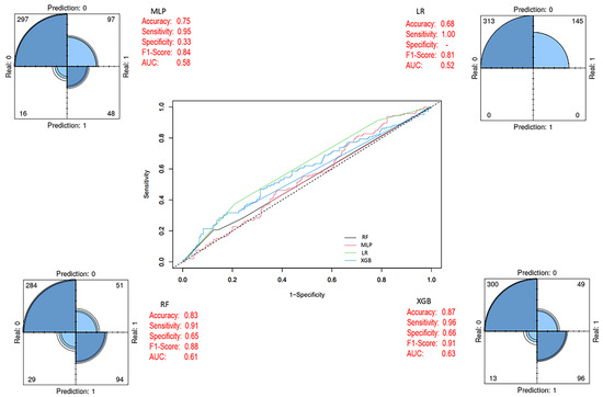 As shown in Figure 6, when trained on the imbalanced training set, the XGB ensemble model achieved higher accuracy, specificity, F1-score, and AUC values compared to the other three models.