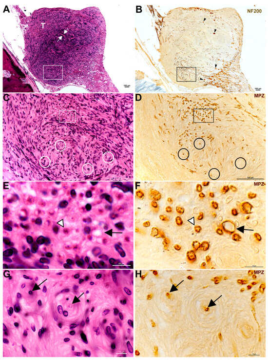 Shows a tumor and nerve from ID #15 (Table 1), a 91-year-old female. Panels (A,C,E,G) show a single hematoxylin and eosin-stained section. Panels B, D, F, and H show a near-serial section to those shown on the left-hand side that is stained for the NF200 Panel (B) and MPZ Panels (D,F,H). Both sets of vertical panels are set up with similar viewing areas for easy comparison. Panel (A) shows the tumor (T) and white arrows pointing to one Antoni A area in the tumor. The white boxed area outlines the area shown in Panel (C). Panel (B) shows the tumor (T) labeled with NF200. Nerve fibers are evident, both within the tumor and along the axons extending both peripherally and centrally. Scarpa’s ganglion cells (black arrowheads) are also evident within the body of the tumor. The black box outlines Panel (F). In Panel (C), onion bulb formations (white circles) are apparent as circles with a center that is sometimes empty or occupied. The white box in Panel (C) outlines Panels (E). Panel (D) (MPZ label) reveals that what is inside of the onion bulb (black circles) is sometimes a nerve fiber in a plane orthogonal to its original course. The two black circles further to the left in Panel (D) each show a myelinated nerve fiber cut in cross section. The other two black circles in Panel (D), lower center and right of center, are around onion bulbs with no apparent fiber visible at their center, presumably demonstrating that the nerve fibers are already demyelinated or fully degenerated. The black box in Panel (D) demarcates the contents of Panel (F). Panel (E) appears to show a bundle of nerve fibers that are running orthogonally to the original plane. The black arrow may be an early onion bulb forming. The white and black arrowhead is pointing to an eosinophilic density. When stained with an antibody against MPZ, it is revealed that the density is a myelinated nerve fiber cut in cross section, shown by the black and white arrowhead on Panel (F). Panel (F) also shows what might be considered an early onion bulb forming. It too has, at its center, a myelinated nerve fiber in cross section (black arrow in Panel (F)), like the fully formed onion. Panel (G) shows two onion bulbs at higher magnification (black arrows) labeled with anti-MPZ that are also seen in Panel (H) (black arrows). The onion bulb areas may become early Antoni B areas as spaces appear to develop surrounding these orthogonal fibers. Please note these white spaces within the onion bulbs. Figure 1 captures the lack of a capsule around the tumor as ganglion cells appear within the tumor matrix. One can also track nerve bundles all the way through the tumor. Figure 1 also demonstrates fiber disarray, onion bulb formation, and presumably demyelination, as some onion bulbs appear to be missing myelin at their centers.