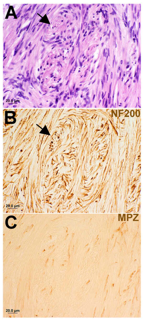 Shows the same individual as in Figure 2, but from a distant area of the tumor. Panels (A–C) are only 20 µm apart from each other and so are serial sections. Panel (A) is the hematoxylin and eosin-stained section, Panel (B) is labeled with anti-NF200, and Panel (C) is labeled with anti-MPZ. The black arrows in both (A,B) point to onion bulbs or early Antoni B areas of the tumor. What is obvious in these three panels is that it is difficult to understand from the hematoxylin and eosin sections just how many nerve fibers remain in an area like this. There are many disorganized nerve fibers within the body of the tumor. What is also evident is that there is markedly less MPZ label (Panel (C)) than there is NF200 label (Panel (B)). It is as if the tumor destroys the myelin prior to the NF200. The fibers seem to be dying from the outside inwards.