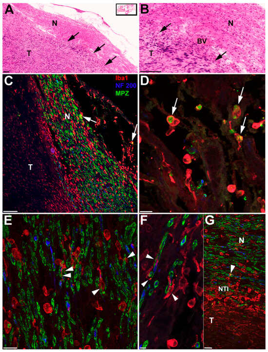 Demonstrates the nerve and tumor with accompanying macrophages from a 100-year-old female who had 0% discrimination in this ear. All panels show two sections from ID #6 (Table 1). Panels (A,B) are from a single hematoxylin and eosin-stained celloidin section (boxed inset Panel (A)) and panels (C–G) are from a second celloidin section, approximately 100 µm from the first, with immunofluorescence labeling for Iba1 (macrophages in red), NF200 (nerve fibers in blue), and MPZ (myelin in green). Panel (A) shows the cochlear nerve (N) and tumor (T). The black arrows are pointing toward the nerve–tumor interface. Panel (B) is a higher magnification of the nerve–tumor interface with a blood vessel (BV) in view. Calibration bars in both (A) and (B) are equal to 100um. Panel (C) is from the same general area as Panel (A), only tilted clockwise by approximately 35 degrees. Once again, the nerve (N) and tumor (T) are shown. The red labeled cells are positive for Iba1, denoting macrophages. The blue label for NF200 can be seen within nerve fibers. And the green label shows the myelin surrounding the nerve fibers. At the tips of both white arrows, are macrophages filled with myelin (greenish yellow inside the red circles). Panel (D)’s white arrows demonstrate a higher magnification of macrophages filled with myelin (green within the red border of the macrophage cell membranes). Panel (E) demonstrates thin macrophage processes (white arrowheads) surrounding nerve fibers (green around the blue profiles) in what may be the initial step to engulfing the fiber completely. In Panel (F), the white arrowheads point to further engulfment, where macrophage cytoplasm is seen penetrating the axon (red coming out of frame through the blue at center of nerve fiber (topmost white arrowhead), while the lower left side white arrowhead shows a process of the macrophage holding on to the fiber. The white arrowhead, in the center of the frame, shows a similar process occurring to a different nerve fiber. Panel (G) shows nerve (N), tumor (T), and the nerve–tumor interface (NTI). The white arrowhead points again toward a macrophage (red) wrapped around the outside of a nerve fiber (green myelin around blue neurofilament). Please note that from the top of Panel (G) toward the bottom of Panel (G) there is a shape change that occurs in the macrophages (cells in red). At the nerve–tumor interface (NTI) this is most obvious, where large round amoeboid macrophages (red) are seen in great abundance. Elsewhere macrophages (red) are seemingly more ramified, with long thinner processes. It would appear from this image that macrophage activation is occurring at the nerve–tumor interface. Calibration lines in Panels (C–G) are equal to 10 µm.
