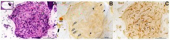 Shown here is the ear from ID#16 (Table 1), an 82-year-old male with a tiny (tumorlet) occult schwannoma within Rosenthal’s canal. The hematoxylin and eosin-stained section is seen in Panel (A). White and black arrows are pointing to onion bulb formations. In Panel (B), a serial section to Panel (A) has been stained with an antibody against NF to label nerve fibers. The filled black arrowheads at the top right and bottom center point to nerve fibers at the center of onion bulbs, within the tumor. The black and white arrows, lower left of center, show nerve fibers within the tumor mass. The single large black arrow, far left, shows nerve fibers near the tumor. A single spiral ganglion cell (SGC) is positive for NF. In Panel (C), a serial section to Panels (A,B) has been stained with an antibody against Iba1 to label macrophages. The black arrows are pointing out that the macrophages are sometimes inserting their processes into the onion bulbs (lower right). Other onion bulbs are circled by what seems like many macrophages at once (black arrows more at center of image (B)). Overall, Panel (B) reveals many Iba1-positive macrophages throughout this tumorlet.