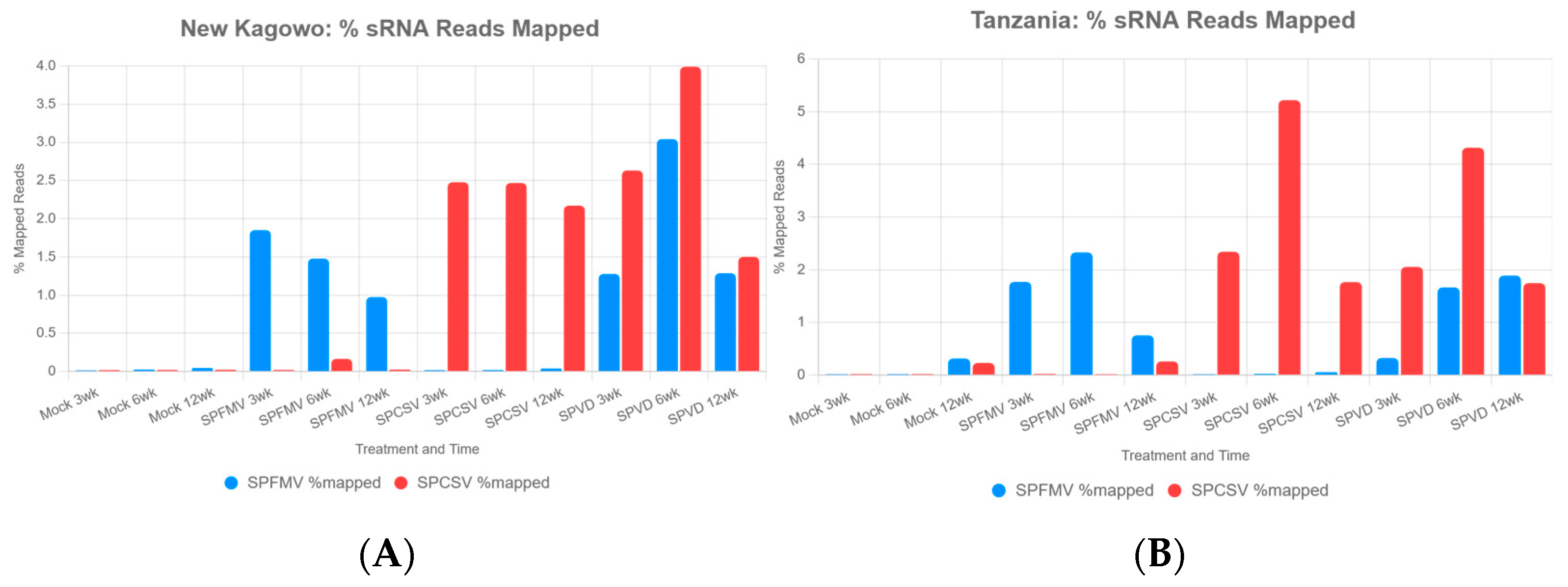 3.2. Small RNA Mapping to Viral Genomes in Sweetpotato